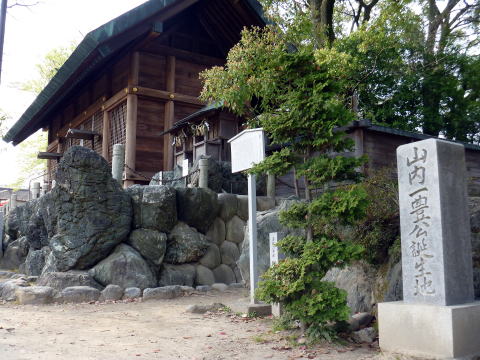 岩倉城の近くにある神明生田神社は山内一豊の生誕地といわれ石碑が建っています。
