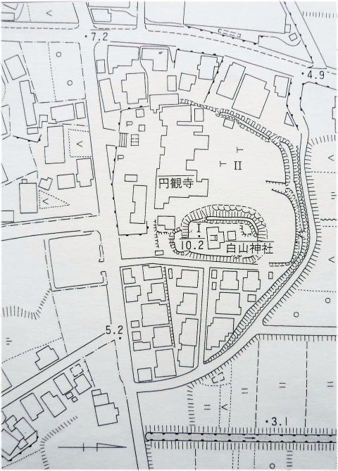 富貴城跡は現在の円観寺、白山社一体と伝わり、白山社には土塁・堀が残り、円観寺には、富貴城の看板が立てられ、周りには『外堀』、『東門』の地名も残されています。