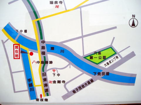 この合流地点、つまり尖っている方は、かつての鳴海城の方を向いており、鳴海城から攻められると、この川の合流地点が待ち受けている形になります。