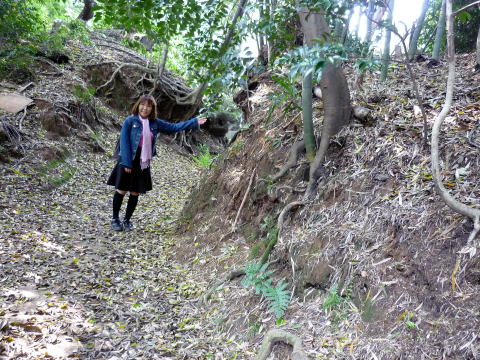 稲荷社の脇にある帯状の削平地。曲輪跡と思いきや、地主さんのお話では昔の道の名残だとか。